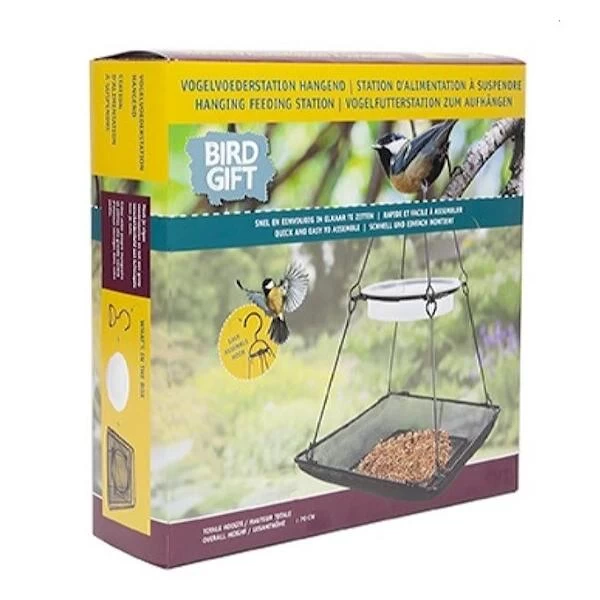 Een voederstation met drinkschaal in 1 geheel, leuk om op te hangen in een boom of aan een rozenboog. Het bestaat uit een ruime voederschaal gemaakt uit gaasdraad zodat het water altijd wordt afgevoerd en een drinkschaal in kunststof die ook dienst kan doen als vogelbad.