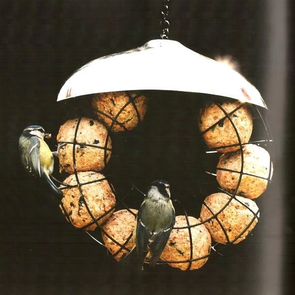 De voederring heeft een metalen regenkap en een ophanghaak. Je hoeft enkel nog een perfecte plek te zoeken om de hongerige vogels die komen eten goed te observeren.