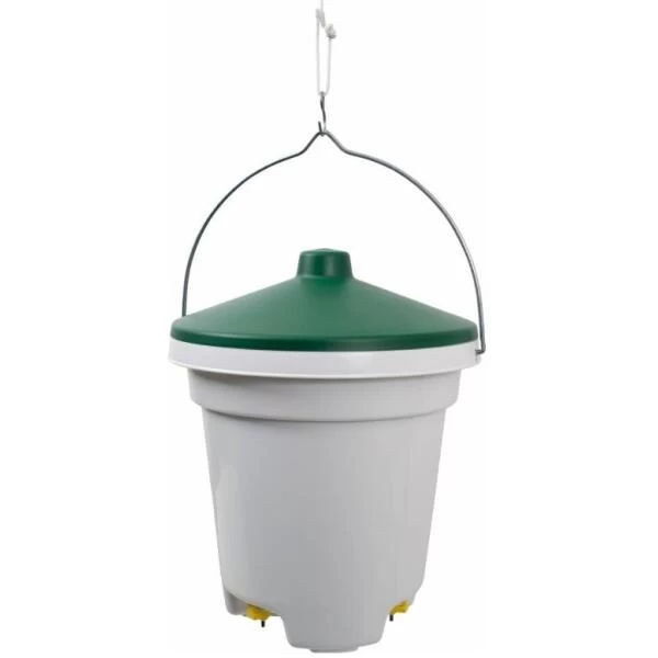 Het water in het afgesloten reservoir blijft steeds vrij van ziektekiemen. De kippen, fazanten of ander pluimvee kunnen het water opnemen via drie nippels. De emmer wordt geleverd als complete set met drie drinknippels, een deksel en een stevige hangbeugel.