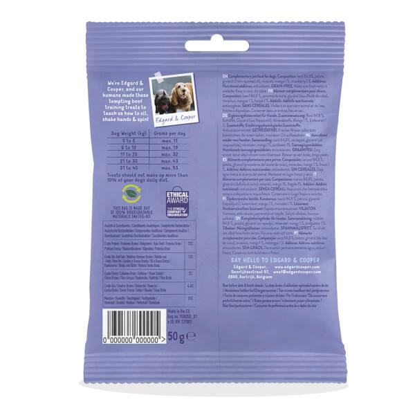 Beloon jouw trouwe viervoeter met deze natuurlijke hondensnack van Edgard & Cooper. Ze zijn op zakformaat waardoor je ze makkelijk kunt meenemen tijdens het trainen of als je gaat wandelen met de hond. Zo heb je altijd een energierijke beloning op zak! De hondensnoepjes zijn bovendien zorgvuldig verpakt in een 100% biologisch afbreekbaar zakje.