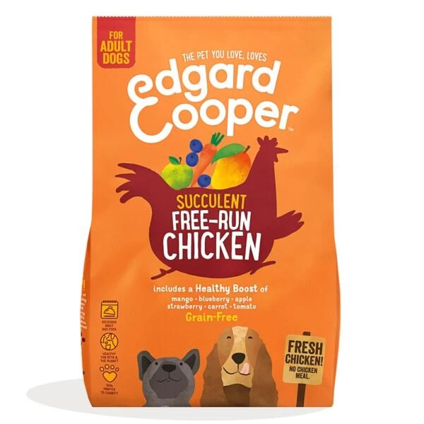 Edgard&Cooper hondenvoeding met verse scharrelkip, mango, blauwe bes, appel en wortel. Dit graanvrije recept met heerlijk verse scharrelkip (zonder gedroogd of gedehydreerd vlees) is caloriearm en rijk aan hoogwaardige eiwitten. Er zit ook prebiotica in voor een gezonde darmflora. Ideaal dus voor gevoelige maagjes.