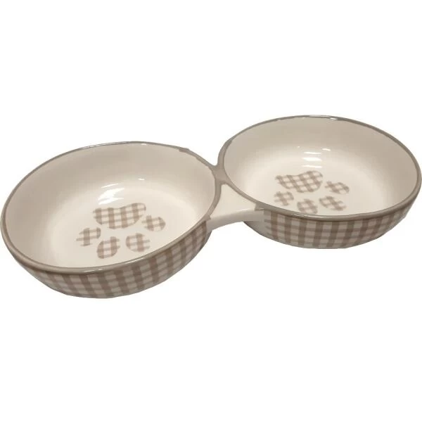 De eetpot is vervaardigd uit keramiek en heeft aan de binnenzijde een print van kattenpoten en aan de buitenzijde een ruitdesign.