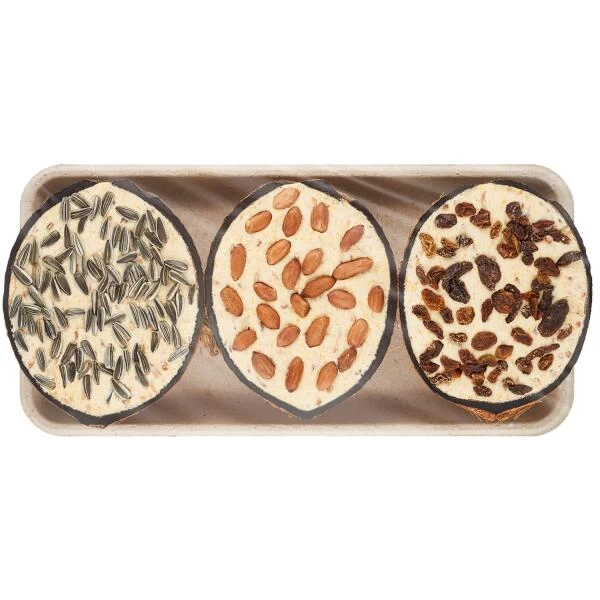 Een assortiment halve kokosnoten gevuld met vetversnaperingen in drie verschillende smaken. Het vet sterkt de vogels aan en zorgt ervoor dat ze hun lichaamstemperatuur kunnen behouden als het buiten echt koud is. Geef dit reeds vroeg in het najaar zodat de vogels een vetreserve kunnen opbouwen en sterk genoeg de winter kunnen ingaan.