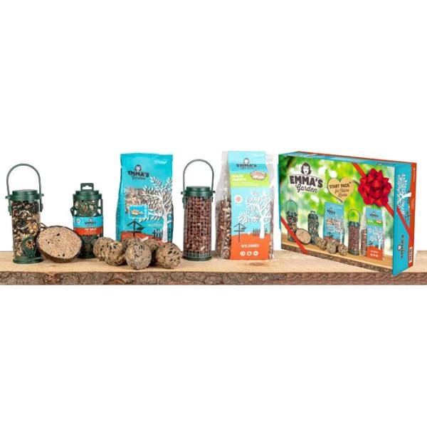 Dit complete starterspakket is speciaal samengesteld om de vogels in jouw tuin heerlijk te verwennen. Het pakket biedt alles om ze te voederen: 3 verschillende voedersilo’s in kunststof gevuld met mezenbollen, pindanoten en een zadenmix; een zak pindanoten; een mengeling met energierijke noten en zaden; 6 premium mezenbollen zonder netje en een gevulde halve kokosnoot.