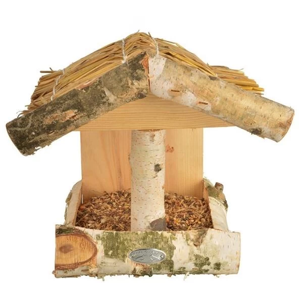 Met deze zeer natuurlijk ogende voederplaats lok je vele vogels naar jouw tuin. De voedertafel is gemaakt uit een basis van grenenhout en afgewerkt met berkenhout en een rieten dak.