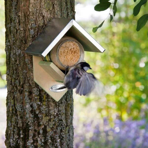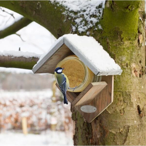 Help de vogels het hele jaar rond aan de nodige energierijke vetreserves en hang een pindakaashuisje op. Wordt onder meer bezocht door merels, roodborstjes, mezen, mussen, boomklevers, spechten,…