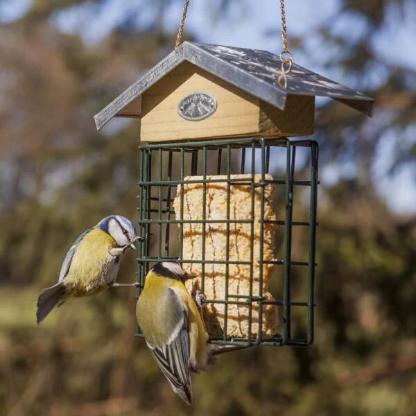 Vogels hebben onze hulp tijdens de koude wintermaanden hard nodig. Deze vetblokhouder mag dan ook in geen enkele tuin ontbreken. In de houder die makkelijk kan geopend worden, past een standaard vetblok. Door het voorziene zinken dak, zal de vetblok beschermd zijn tegen de regen en langer vers blijven.