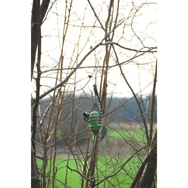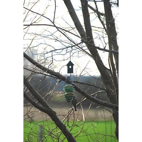 Met deze decoratieve donkergroene vogelvoederveer hang je eenvoudig vetbollen op in de tuin of op het balkon. Bovenop staat een huisje of een vogel als decoratie wat deze vetbolspiraal uniek maakt. De vogels in de tuin gaan eraan hangen en pikken gemakkelijk het vet uit de bol. Dit levert een prachtige aanblik.