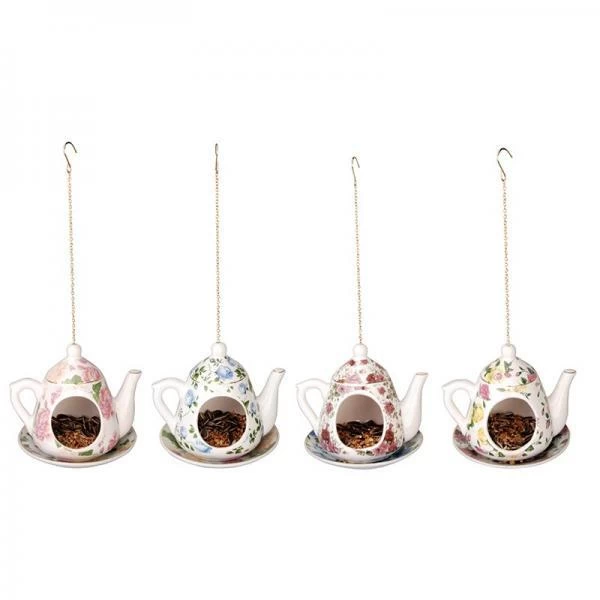 Dit uniek assortiment van theepotjes is prachtig als decoratie in elke tuin. Hiermee creëert u een aantrekkelijke plaats om kleine tuinvogels te voederen met zaden en andere lekkernijen.