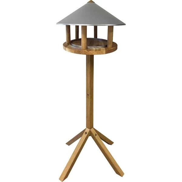 Kwalitatief, rond voederhuis in eikenhout met een mooi en modern design. Het open voederhuis is afgewerkt met een conisch dak in gegalvaniseerd staal en is dus mooi waterdicht. Dit voederhuis op paal is van een zeer kwalitatieve Deense makelij. Het duurzame eikenhout is met olie behandeld.