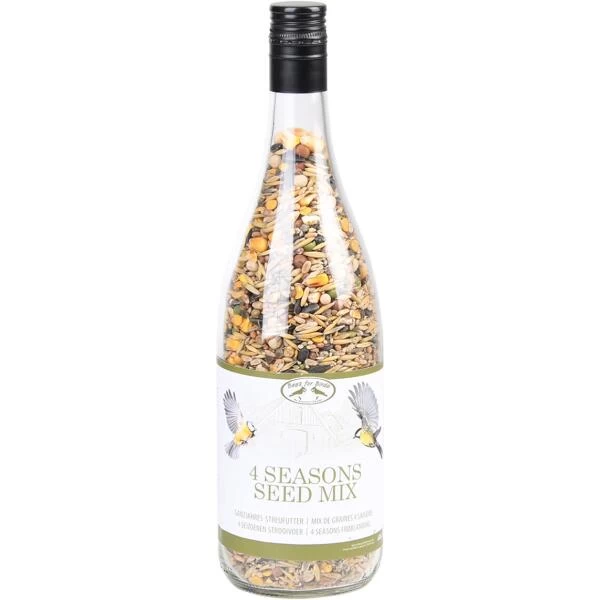 Lok vogels naar de tuin met deze wijnfles gevuld met strooivoer. De fles is gevuld met tarwe, sorghum, gierst, zwarte zonnebloempitten, gestreepte zonnebloempitten, vlas, gebroken maïs, hennepzaad, bonen, haver, wikke, velderwten en zwarte haver. Geschikt voor verschillende soorten zoals mezen, mussen, roodborstjes, boomklevers, boomkruipers, groenlings en vinken.