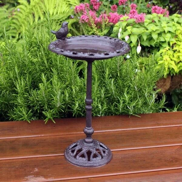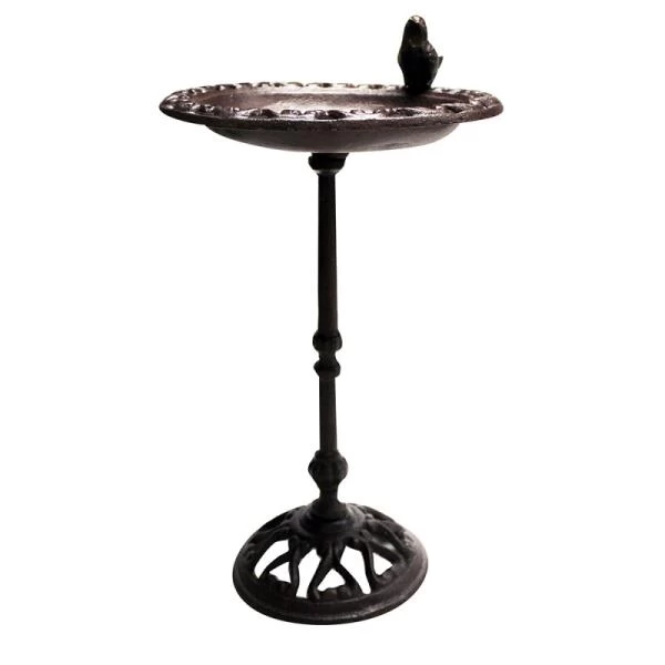 Het vogelbad is gemaakt uit gietijzer en rust op een stevige en sierlijke voet. Een decoratieve vogel heeft zich op de rand van de schaal genesteld. De andere vogels in jouw tuin zullen snel volgen.