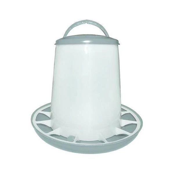 Graansilo in witgrijze kunststof voor kippen, duiven of andere vogels. Makkelijk op te vullen met voer of water door de silo open te draaien. De dieren kunnen via de openingen in de schaal tot bij het voer of drinken geraken.