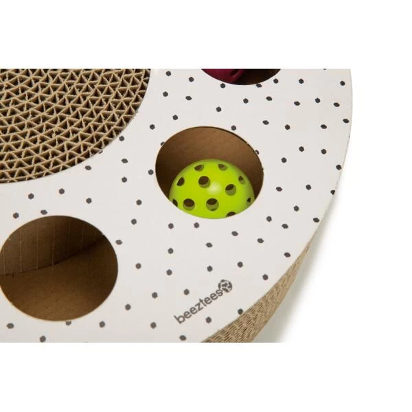 Enerzijds kan dit speelgoed worden gebruikt om lekker te krabben. De zijkant en de cirkel in het midden zijn namelijk gemaakt van krabkarton. Daarnaast kan het spelletje ook worden gebruikt om het balletje te pakken te krijgen.