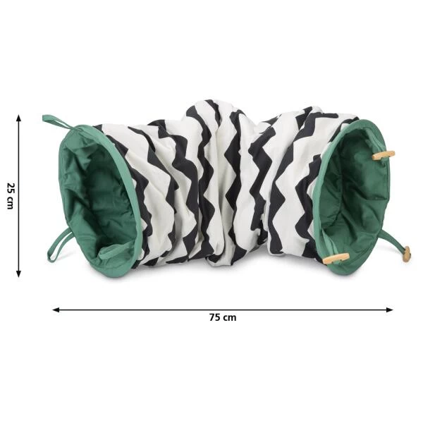 De binnenzijde is afgewerkt met polyester zodat hij zacht aanvoelt voor jouw kat. Is de kat aan rusten toe, dan klap je de tunnel eenvoudig in elkaar en kan je hem opbergen indien gewenst.