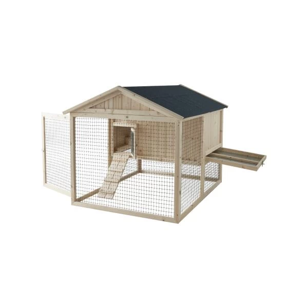 Geef jouw kippen een veilige en ruime thuis met dit mooie kippenhok. Het hok bestaat uit een verhoogd nest met zitstok, toegankelijk via het loopplankje, en een ruime buitenren waar ze vrolijk kunnen rondscharrelen. Het geheel is overdekt met een waterdicht dak in bitumen. Met dit hok zijn jouw kippen beschermd tegen roofdieren, terwijl ze toch nog voldoende ruimte hebben.
