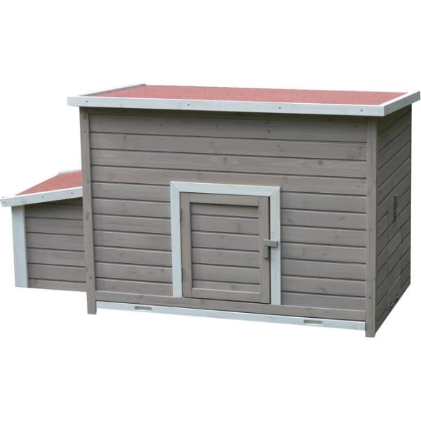 Dit hok staat laag bij de grond en beschikt over een mestlade. Zowel het deurtje in de voorkant alsook het zijdeurtje rechts kunnen op eenvoudige wijze worden afgesloten. Het deurtje van de hokingang vormt meteen ook de loopplank waarlangs kippen vlot in en uit het hok lopen.