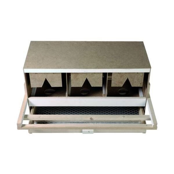 Houten legnest voor kippen. De bodem van dit driedubbele nest bestaat uit een schuinaflopend rooster waarop de kip haar ei legt. Als de kip het nest verlaat, rolt het ei over het rooster in een opvangbakje vooraan aan de legbak waar de eieren worden verzameld.