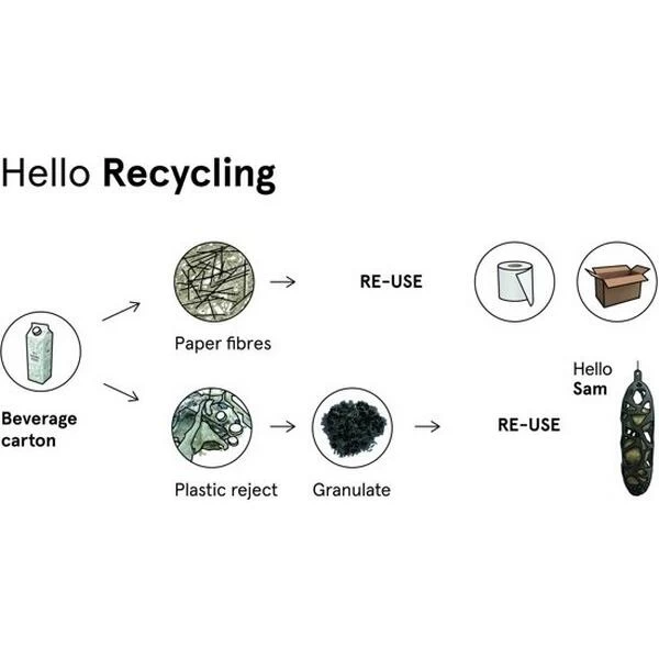 De Hello Sam mezenbolhouder is gemaakt uit 100% gerecycleerd materiaal afkomstig uit tetrabriks. Door deze mezenbolhouder in jouw tuin te hangen help je dus niet alleen de tuinvogels maar draag je ook jouw ecologisch steentje bij.