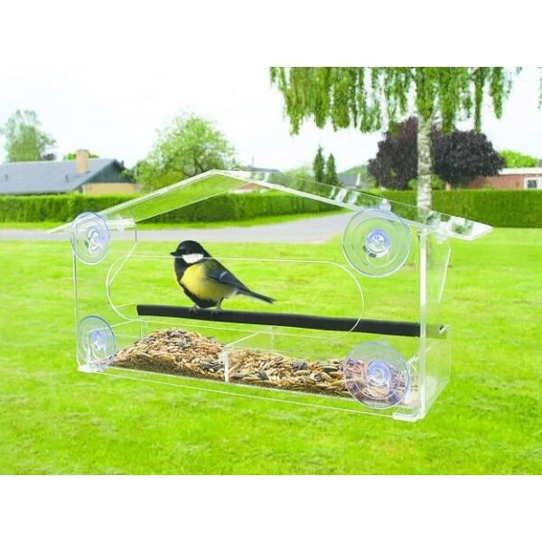 Het huisje is voorzien van vier krachtige zuignappen en heeft een geperforeerde bodem om eventueel regenwater af te voeren. De tweedelige afneembare invoerlade is voorzien van een rubberen rand waarop de vogels kunnen zitten.