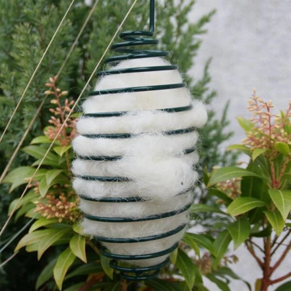 Deze wol kunt u aan een tak van een struik of boom hangen of je kunt ze aan de vogels bezorgen in de vetbolspiraal – wolveer zodat de vogels er zelf de nodige wol uit kunnen trekken, naargelang hun nestgrootte. Hang de Britse wol bij voorkeur op een zichtbare plaats in de buurt van struiken of nestgelegenheden. Indien mogelijk ook ergens beschut proberen houden zodat de wol niet nat kan worden bij hevige regenbuien.