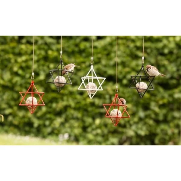 Deze stervormige vetbolhouder is een origineel decoratief element voor in elke tuin, groot of klein. Dankzij het meegeleverde staalkabeltje (ca. 90 cm) kan deze ster op elke plekje in de tuin worden opgehangen. In een boom, aan het afdak of in het struikgewas. In de onderste punt van de ster is er plaats voorzien voor één vetbol.