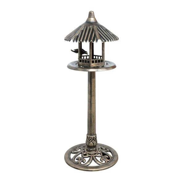 Decoratief, rond vogelvoederhuis in kunststof. Dit weerbestendige, bronskleurige voederhuis met een klassieke look lijkt uit een kasteeltuin te komen. Het grote dak beschermt het voeder op de voedertafel zodat het langer vers en droog blijft.