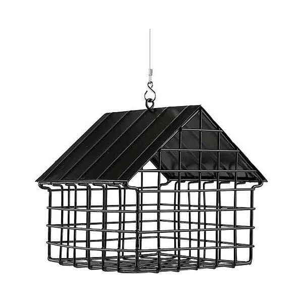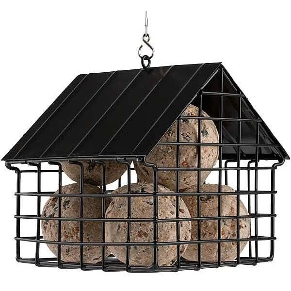 De houder is volledig uit metaal en is voorzien van een zwarte coating. De ene zijde van het dak klapt open om de vetbollen makkelijk te kunnen aanvullen. Met de bijgeleverde metalen ophangdraad kan je het voederhuisje in een boom hangen of aan een voederhaak.