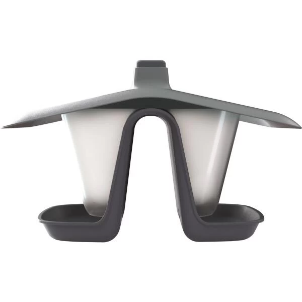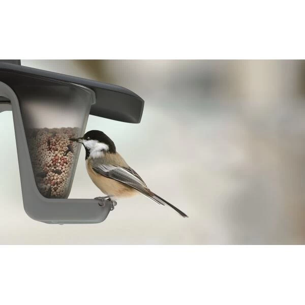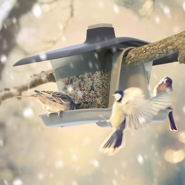 De drie onderdelen zijn handig demonteerbaar, de onderschaal is geperforeerd en het dak beschermt het voedsel tegen regen en sneeuw.