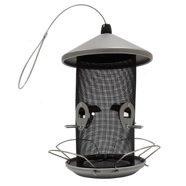 Deze silo in metaal heeft een ruime inhoud van 3 kg. De silo kan gebruikt worden voor vele soorten zadenmix en voor gepelde en ongepelde zonnebloempitten. Het voeder is bereikbaar door 4 voederopeningen halverwege de silo en onderin de voederschaal. De voederschaal is bovendien voorzien van 4 ruime zitbeugels.