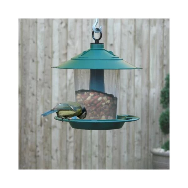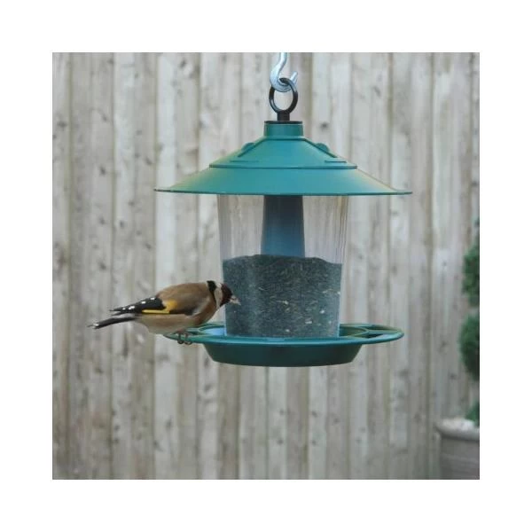 De vogels kunnen vanaf de voorziene zitrand de zaden uit het opvangbakje oppikken. De voedersilo is makkelijk aan te vullen door de opening van het dak. Draai hiervoor het dak naar links of naar rechts.