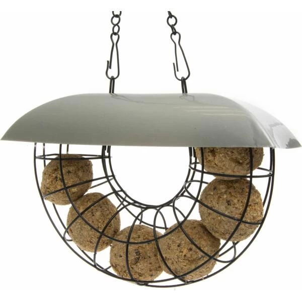 Een degelijke mezenbolsilo in de vorm van een halve maan met 6 mezenbollen in één pakket. De silo in metaal is voorzien van een deksel zodat de bollen beschermd zijn tegen regen. Met de voorziene ketting en haak kan je de silo makkelijk ophangen op een veilige plaats die vrij toegankelijk is voor de vogels: in een boom, struik, voederhaak of voederstation.