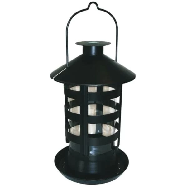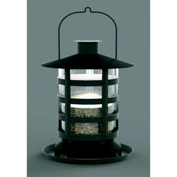 De voedersilo is vervaardigd uit een koker in plexiglas omringd door een zwart metalen behuizing. De koker rust op een ruime schaal waarop de vogeltjes kunnen landen en vervolgens van het voeder kunnen smullen bij één van de drie openingen. In de schaal zijn ook gaatjes voorzien om het water af te voeren. Dankzij het grote puntdak blijft het voeder langer vers en droog. In het dak zit een led lampje dat werkt op zonne-energie. Eens het begint te schemeren zal het lampje automatisch branden en de voedersilo sfeervol verlichten.