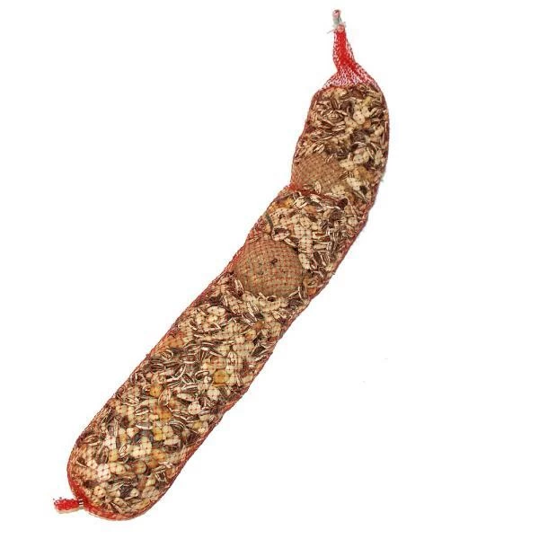 Een voederslinger met een assortiment aan zonnebloempitten, pinda’s en vetversnaperingen, gebundeld in een netje. Hang het netje met voeder op een strategische plaats weg van katten en andere predatoren zodat de vogels veilig en makkelijk van het voeder kunnen smullen.