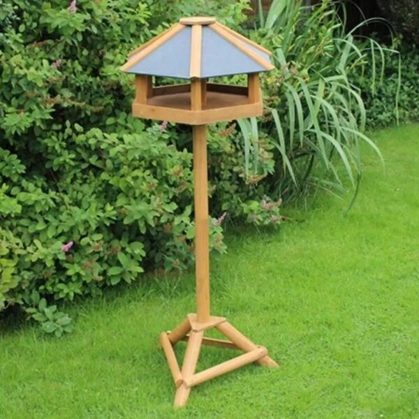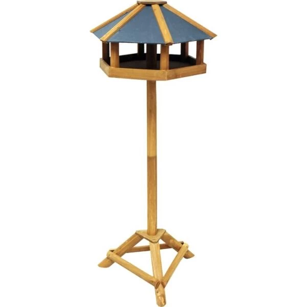 De ruime zeshoekige voedertafel is overdekt met een groot dak zodat het voeder droog en langer vers blijft. Het dak heeft een leisteen effect en de tafel en statief zijn gemaakt uit grenenhout. Met de voorziene voet kan je de voedertafel op een eenvoudige manier een plekje geven in de tuin, op het terras,… Op deze voedertafel zitten de vogels veilig voor katten en roofvogels.