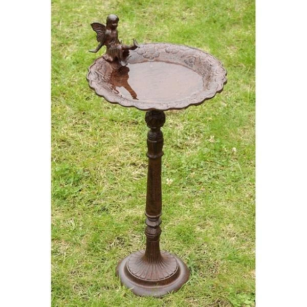 Dit zeer kwalitatieve en zware vogelbad op voet is een streling voor het oog in elke tuin. Het heeft een rustiek bruine kleur die het bad een oud, antiek en aantrekkelijk uitzicht geeft. Op de rand van de schaal staat een gietijzeren beeldje van een lieflijk elfje met een vogeltje op haar voet. Je kan het vastzetten op de rand van de schaal met de bijgeleverde schroef en je kan kiezen of je de voeten van het elfje naast of boven het vogelbad laat hangen.